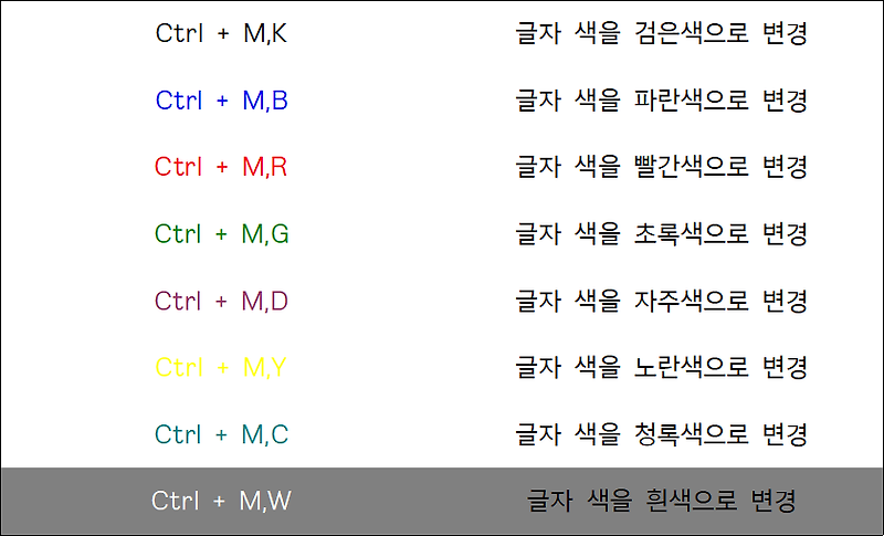 빨간색 외에도 한글에서는 다양한 색을 단축키를 사용해 변경할 수 있습니다. 한글에서 단축키를 이용해 바꿀 수 있는 색상은 총 8가지로 빨간색(R), 검은색(K), 파란색(B), 초록색(G), 노란색(Y), 자주색(D), 청록색(C), 흰색(W)입니다. 각 색깔마다 Ctrl + M은 공통적으로 사용하는 부분이며 뒤에 오는 단축키는 각 색깔의 첫 알파벳입니다. 검은색만 B가 아니라 K를 사용하는데 파란색과 첫 알파벳이 B로 같기 때문에 마지막 알파벳인 K를 사용합니다.