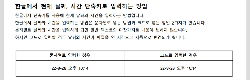 한글에서는 날짜를 단축키를 이용하여 입력할 수 있습니다. 단축키를 날짜를 입력하는 방법에는 문자열로 넣는 방법과 코드로 넣는 방법 2가지가 존재합니다. 날짜를 문자열로 입력하는 방법은 Ctrl + K + D, 코드로 넣는 방법은 Ctrl + K + C입니다.